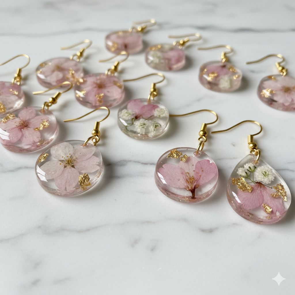 本物の押し花を封入したレジンピアス8デザイン。桜、かすみ草、ビオラなど季節の花を使い、透明感と繊細さを表現。minneで販売し、累計30点以上が完売。「光に透かすと花びらがきれい」とレビューで好評。