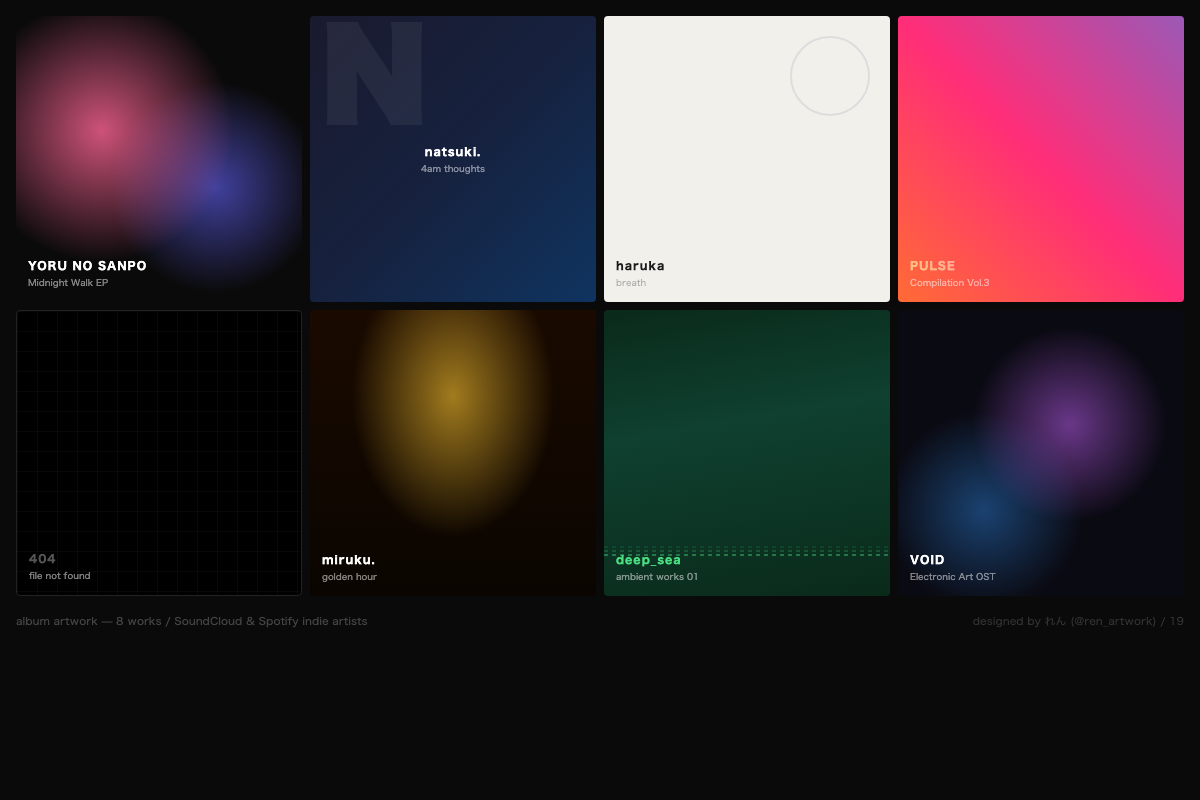 SoundCloudでインディーの曲を聴くのが好きで、「この曲すごくいいのにジャケットがダサいな」って思うことが結構あった。 それがきっかけでアーティストにDMして「ジャケット作らせてください」って言い始めました。最初はタダで。3人目くらいから「いくらですか」って聞かれるようになった。 一番大事にしてるのは「曲を聴いた瞬間の色」を出すこと。全部違うスタイルで作ってます。